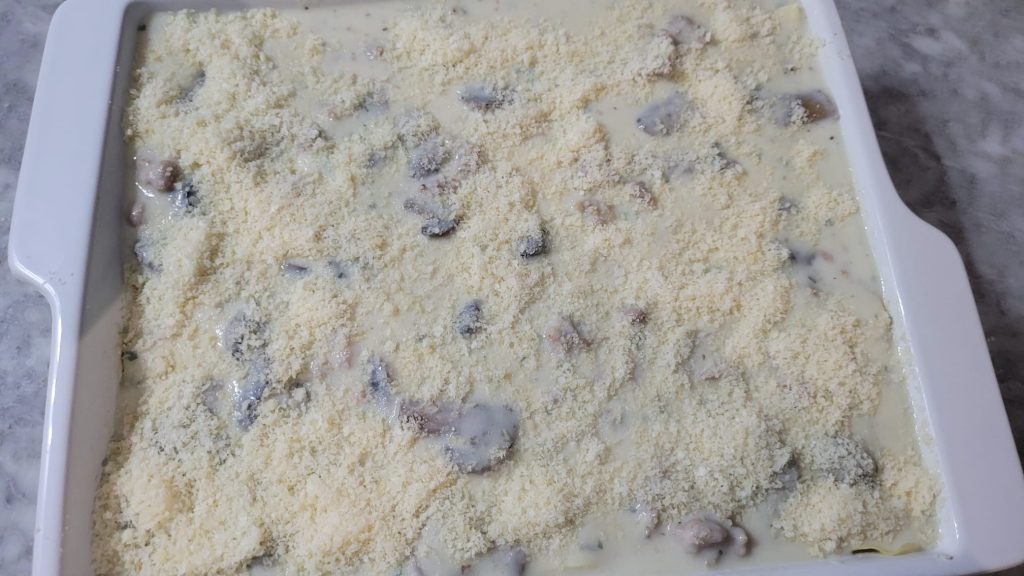 Giet de bechamelsaus met de champignons en worst over de vellen, verdeel goed en voeg de geraspte Grana Padano toe