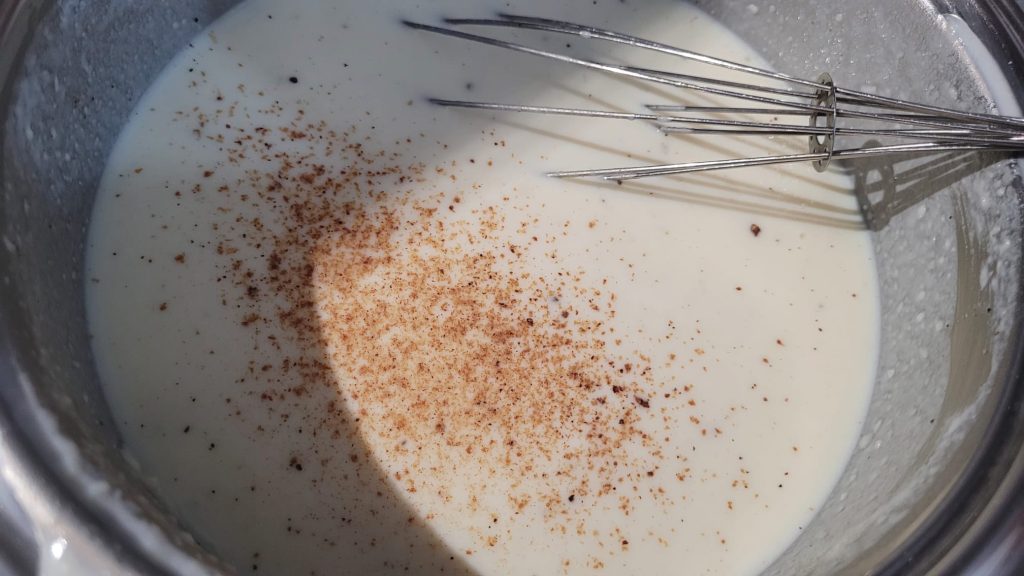 Voeg de melk toe en blijf roeren om klontjes te voorkomen. Voeg zout, peper en een royale hoeveelheid geraspte nootmuskaat toe. Kook verder totdat de melk begint in te dikken maar niet te veel, het moet niet te dik zijn