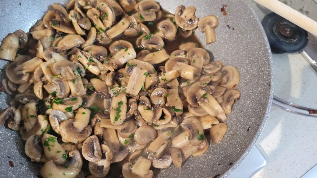 Verwijder het deksel, voeg de peterselie toe als je dat lekker vindt, en ga door totdat het water dat de champignon heeft vrijgegeven is verdampt.