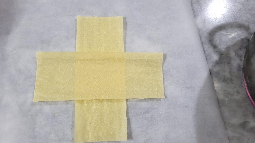 Snijd het deeg halverwege de lange kant door en kruis het op deze manier