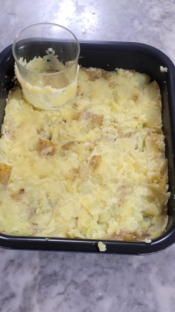 • Begin met het pletten van een aardappel per keer met de onderkant van het glas en bedek de hele ovenschaal