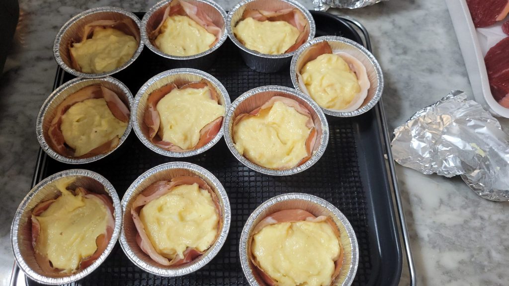 Vet de aluminium bakvormpjes licht in en plaats de plakjes spek erin, zodat het aan de wanden blijft plakken en de bodem goed bedekt.