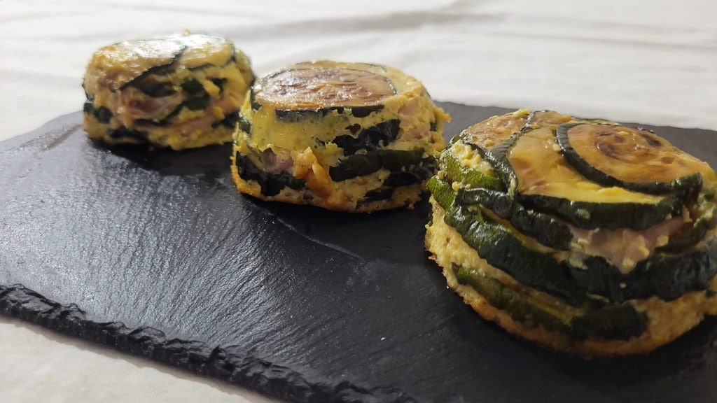De mini courgette parmigiana zijn eenvoudig te bereiden: wissel eenvoudig de lagen van eerder in de airfryer gekookte courgettes af met gekookte ham, gesmolten kaas of mozzarella, in een aluminium vormpje.