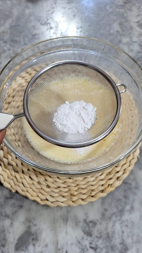• Voeg de gezeefde bloem en het rijsmiddel toe