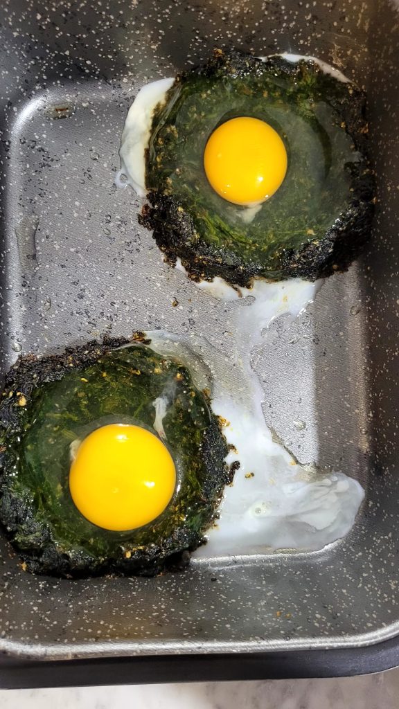 Als je geen airfryer hebt, kun je de nestjes van spinazie en eieren in een pan bereiden met een deksel