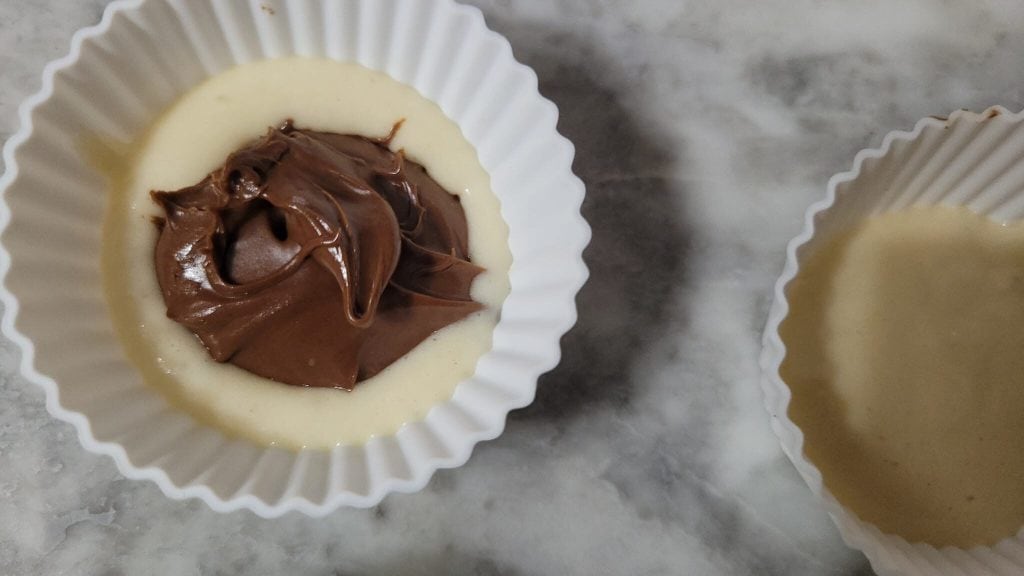 Doe een beetje van het beslag in de vormpjes, voeg de Nutella toe die je in de vriezer hebt gelegd en dek af met nog wat beslag.