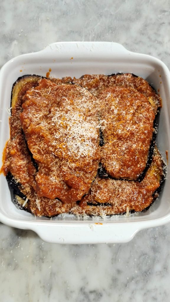 Maak een andere laag aubergines, saus en geraspte pecorino