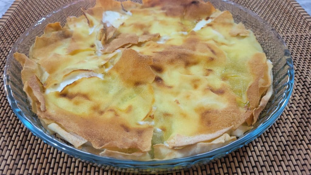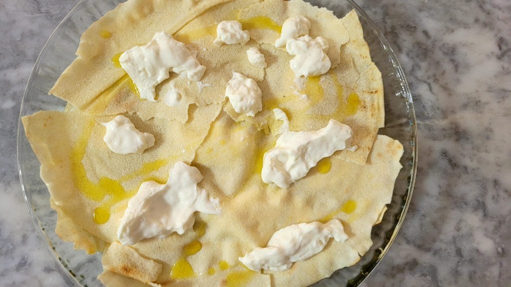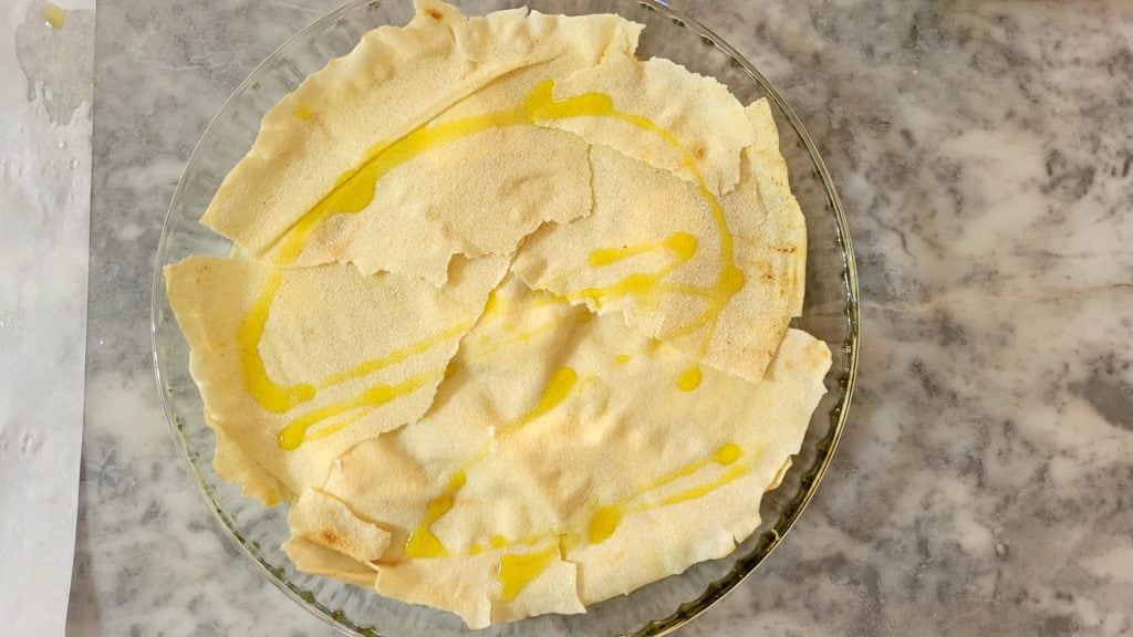 Bedek met andere vellen en ga verder in volgorde tot de ingrediënten op zijn, eindigend met een laatste laag vel besprenkeld met extra vierge olijfolie