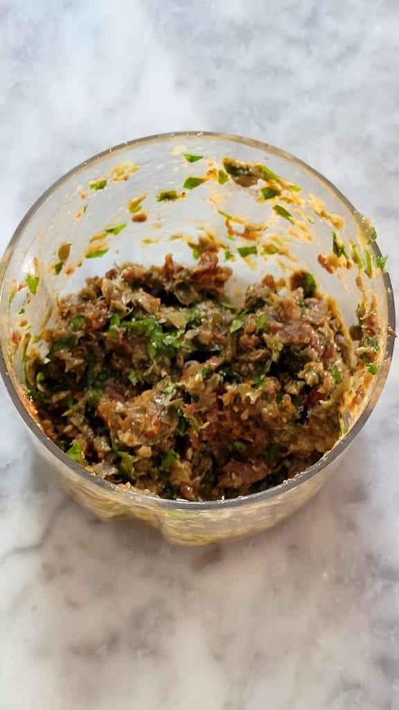 Voordat je begint, week de rozijnen in een kopje of kom met warm water gedurende 10 minuten en zodra ze klaar zijn, knijp je ze uit en doe je ze in de hakmolen samen met de peterselie, kappertjes, ansjovis en gedroogde tomaten