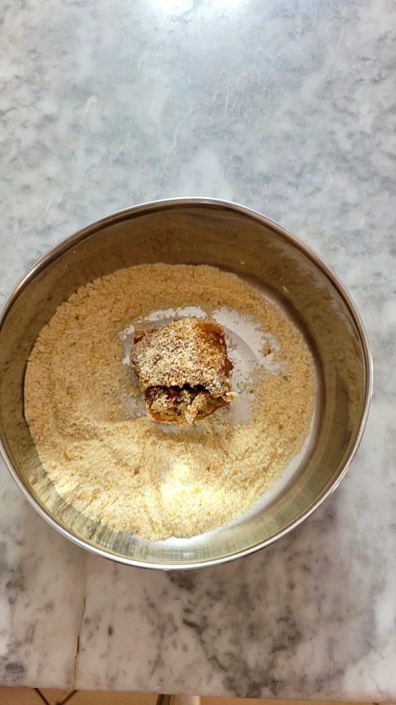 Terwijl je ze paneert, plaats je de rolletjes in een licht ingevette ovenschaal. Besprenkel met een scheutje extra vergine olijfolie