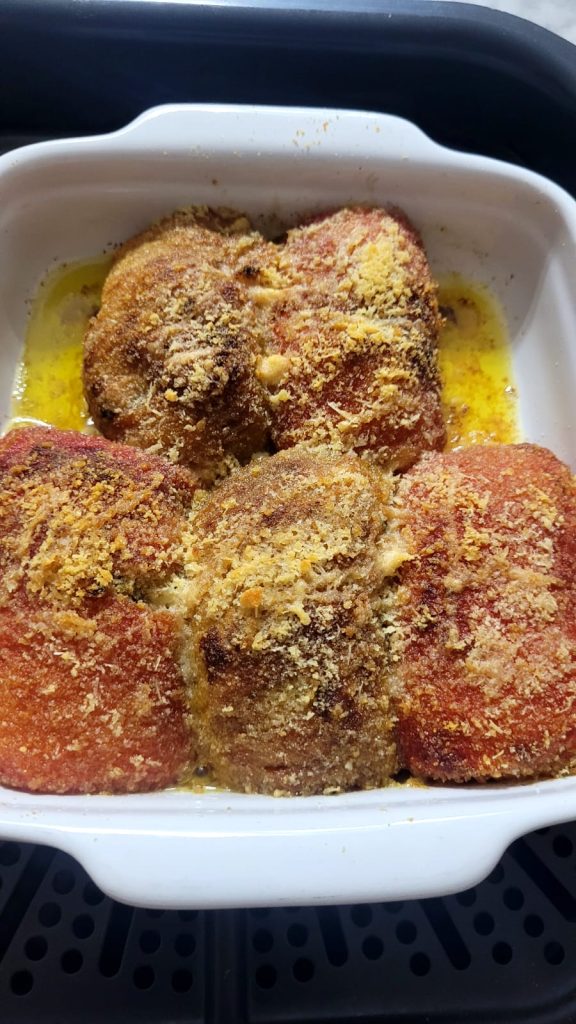 Met de overgebleven vulling kun je heerlijke gehaktballetjes maken, door ze alleen door paneermeel te halen, te besprenkelen met olie en ook in de airfryer te bakken