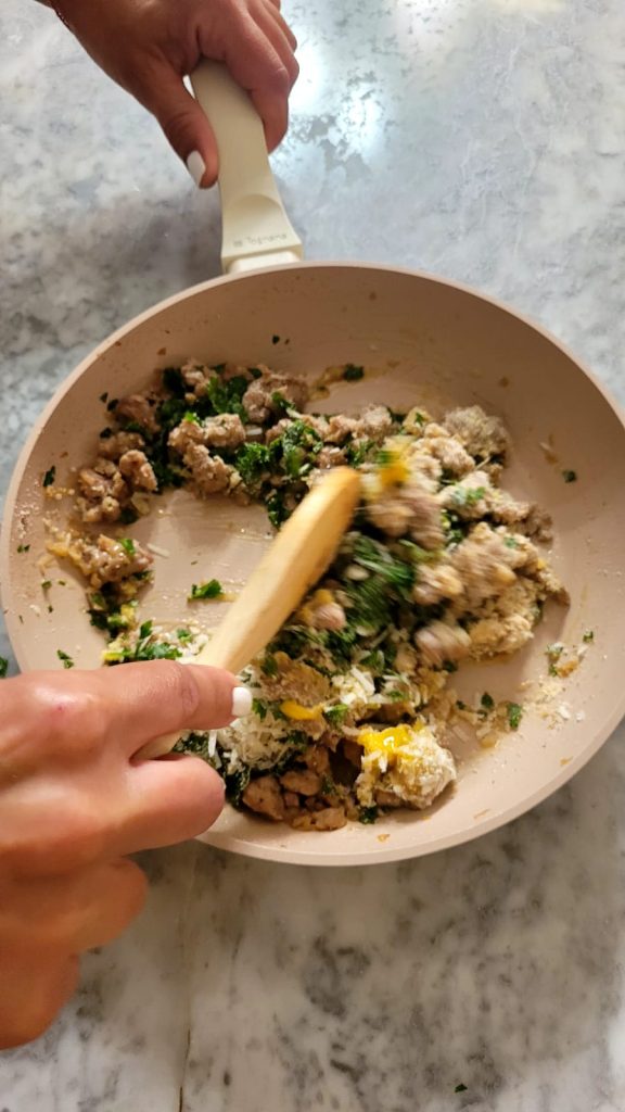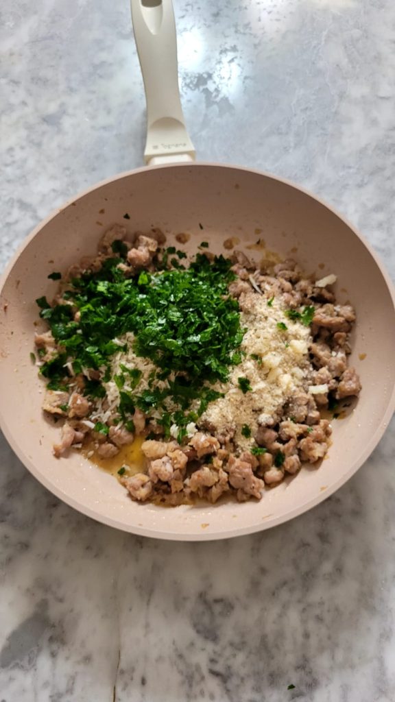 Voeg de geraspte pecorino romano, peper, peterselie en een snufje zout toe, maar overdrijf niet, de worst is al zout en je zou een te zoutgerecht kunnen krijgen