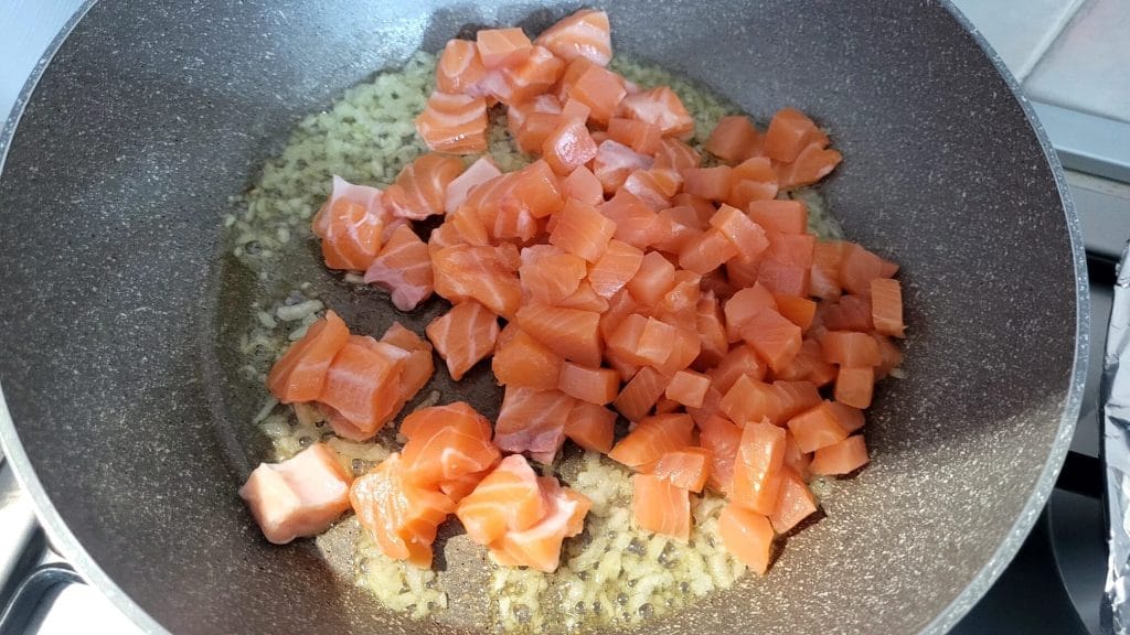 Terwijl de ui kookt, snijden we ook de gerookte zalm in blokjes. Zet ondertussen de pan met gezouten water op het vuur om de penne te koken