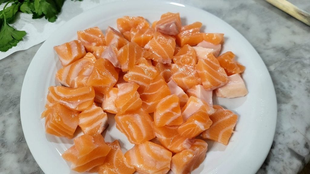 Snijd de zalm opnieuw in blokjes zoals de verse