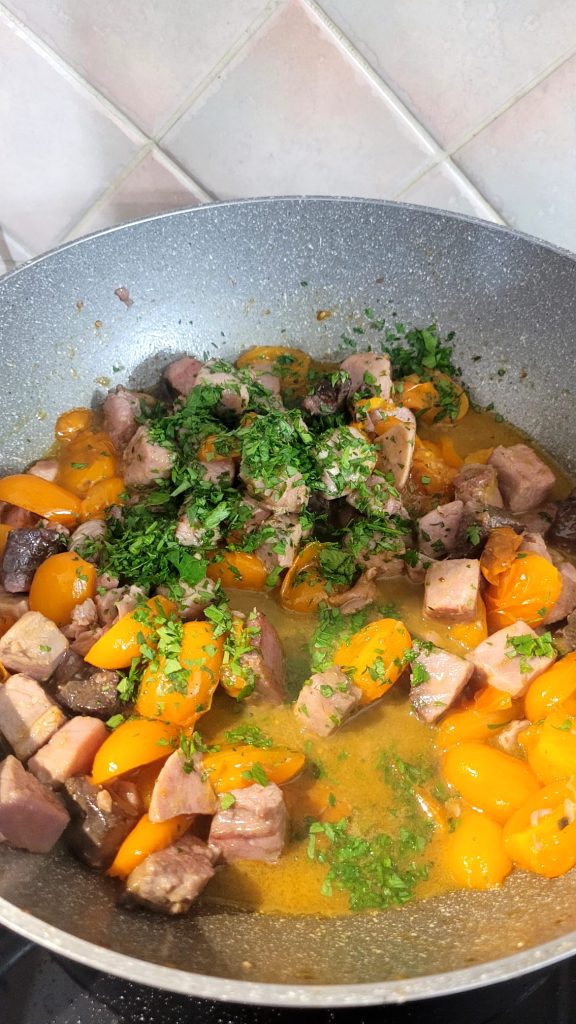 Maak het gerecht af met vers gehakte peterselie en citroenschil die een frisse en citrusachtige noot aan het gerecht toevoegt