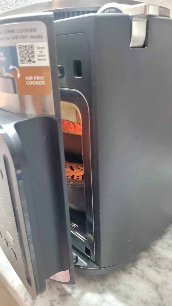 • Verwarm de airfryer 2/3 minuten voor en plaats de vorm op het rooster. Bak met het programma ‘bake’ of ‘air fry’ gedurende 35 minuten. Controleer met een satéprikker op meerdere plaatsen, niet eerder dan na 25 minuten. Als de prikker droog is, is hij gaar; anders bak je verder