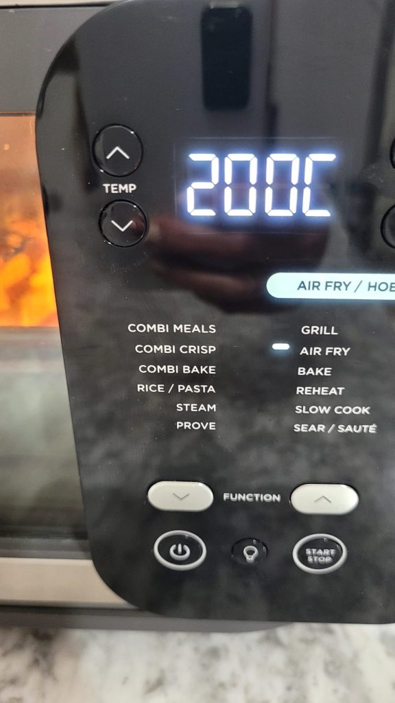 Plaats de bakplaat op het rooster van de airfryer en bak, met het airfry-programma op 200° voor 7 minuten, meng tijdens het koken