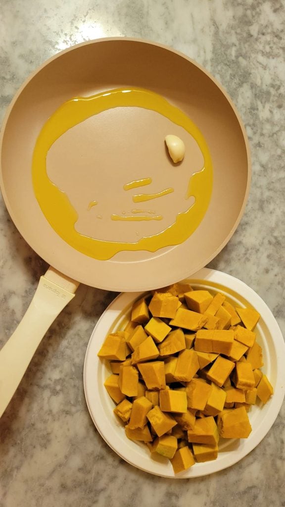 • Maak de pompoen schoon door de schil, de zaden en de binnenste draden te verwijderen. Snijd het in stukjes. In een pan bak een teentje knoflook op laag vuur met een scheutje olie