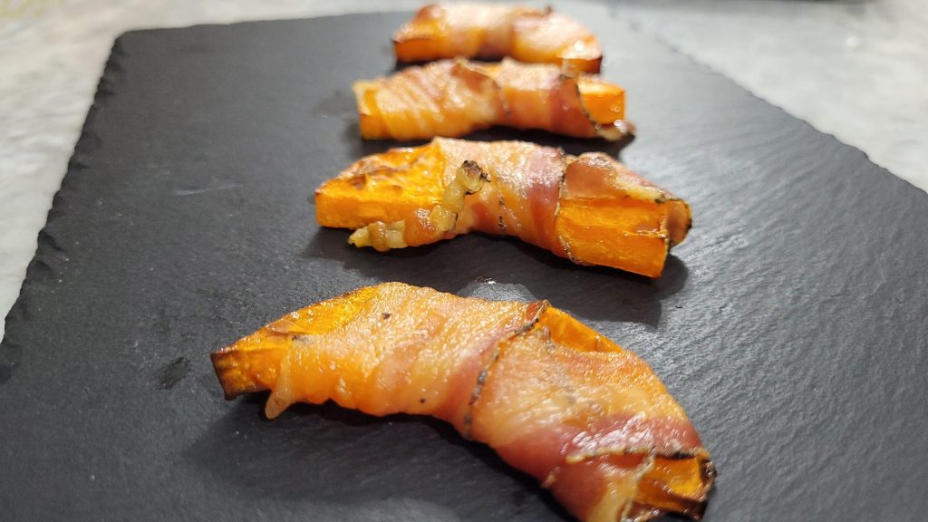 Pompoen met Spek in de Airfryer is een gemakkelijk en snel bijgerecht om te bereiden en je hebt slechts 2 ingrediënten nodig: pompoen en spek. De zoete smaak en zachte textuur van de pompoen, in contrast met de sterke en knapperige spek, zullen je verrassen. Dit recept is ook geschikt als je je gasten wilt verrassen met een ongebruikelijk voorafje.