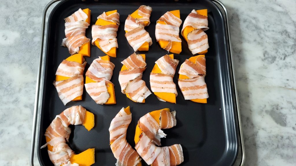 • Rol elke pompoenplak op met 1 plak spek (als je een grotere pompoen gebruikt, heb je er 2 nodig per pompoenplak) en plaats het in een bakplaat of direct op het rooster van de airfryer