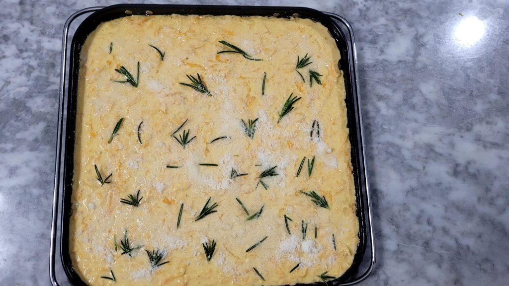 Verdeel het in de licht ingevette bakvorm, bestrooi de bovenkant met rozemarijn en geraspte grana kaas en besprenkel met wat olie