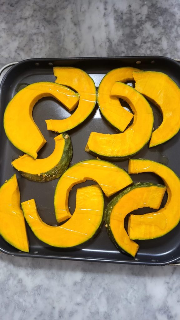Begin met het snijden van de pompoen in plakken van ongeveer 2-3 cm, verwijder de zaden en draden en leg ze op het dienblad of rooster van je airfryer.