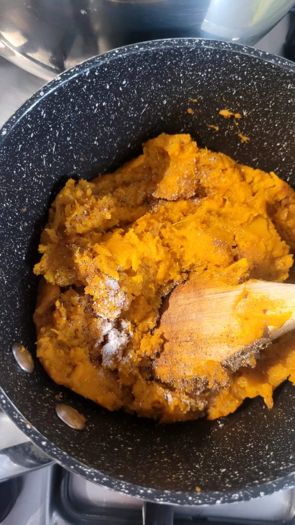 Voeg de pompoen toe, prak deze met een lepel en breng op smaak met zout en peper. Laat het enkele minuten sudderen, onder voortdurend roeren, en laat het vervolgens enkele minuten afkoelen