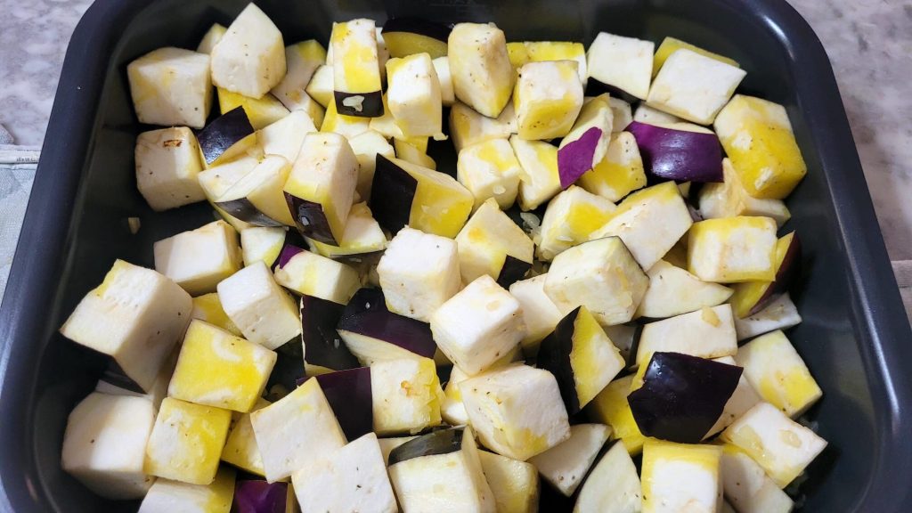 • Voeg nu de aubergine toe, die je apart hebt gehouden, en de kaasblokjes, en meng goed
