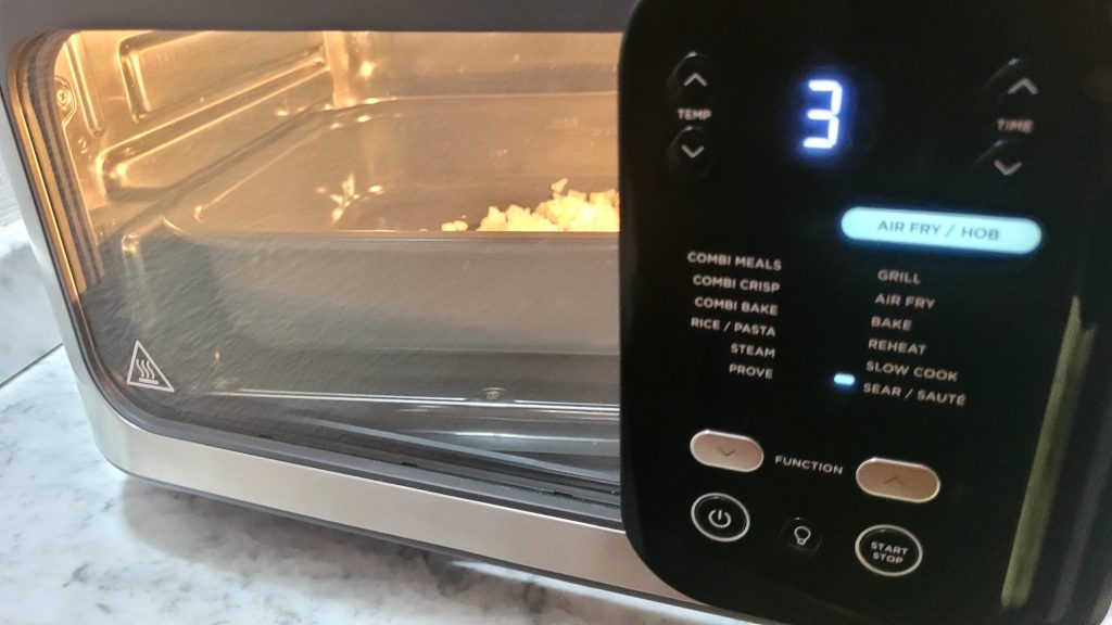 • Maak de ui schoon en laat deze glazig worden met een scheutje olie. Dit kun je doen met de air fry functie op 160°/170° voor een paar minuten, zorg ervoor dat het niet aanbrandt, of in een kleine pan