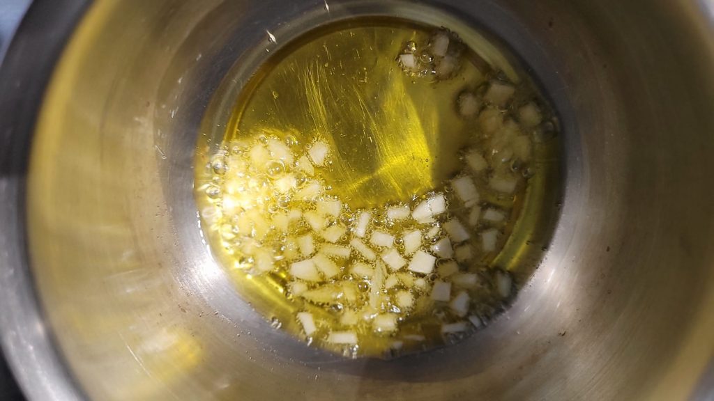 Snijd ondertussen een teen knoflook in kleine stukjes en doe ze in een steelpan, voeg de olijfolie toe tot de knoflookstukjes bedekt zijn en zet op laag vuur. Zodra de olie suddert, haal je het van het vuur en laat je de knoflook licht bruin worden.