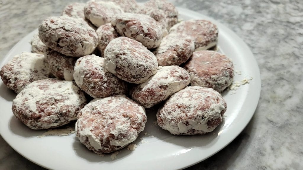 • Neem stukjes van het mengsel en vorm de gehaktballen door ze lichtjes plat te drukken