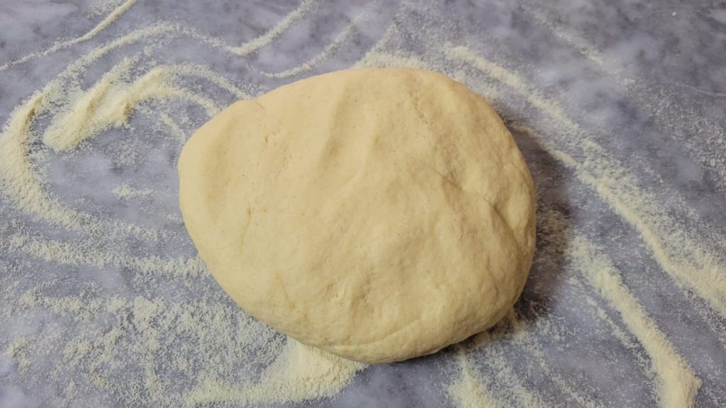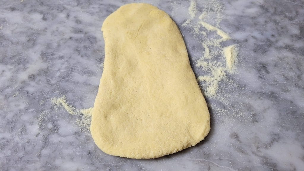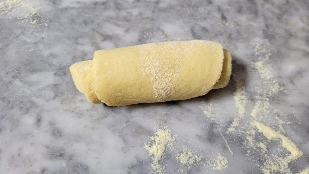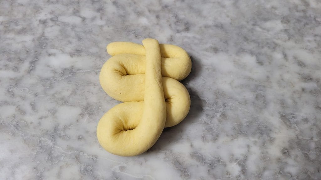 Na de rusttijd rol je het rolletje uit, vorm een koord dat dikker in het midden en dunner aan de uiteinden is. Ga verder met het maken van de mafalde, vorm een slangenlijn, neem het uiteinde van het koord, breng het over het midden en sluit het voorzichtig af