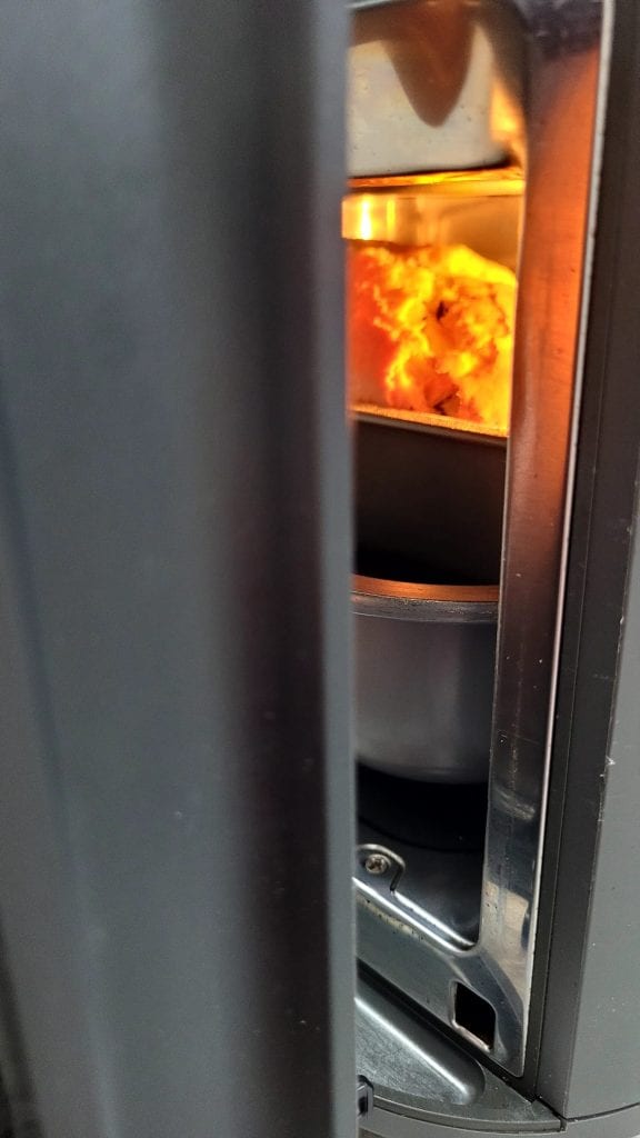 Verwarm de friteuse voor op 2/3 minuten, plaats de vorm op het rooster en start het bakprogramma op 160°C voor 35 minuten. Doe altijd een priktest op meerdere punten en vooral in het midden, als het droog is is de cake klaar, anders bak je nog 5 minuten.
