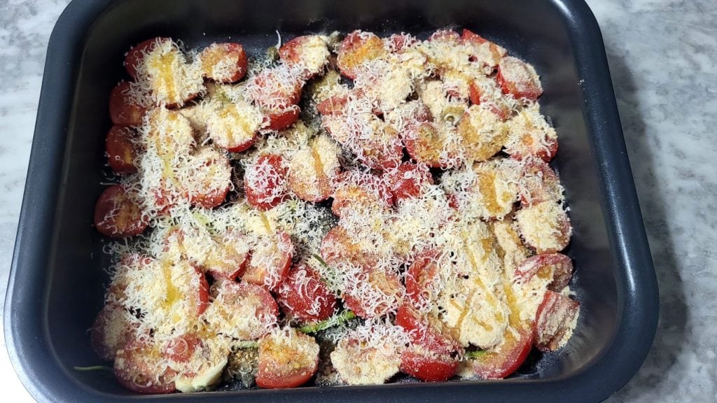 De spaghetti met gegratineerde tomaten is een eenvoudig en tegelijkertijd bijzonder hoofdgerecht. De combinatie van de zoetheid van de tomaat met kappertjes, ansjovis en de sterke smaak van Parmezaanse kaas, die gegratineerd een bijzondere smaak aan deze spaghetti geeft, is aangenaam. Mijn recept vereist het gebruik van spaghetti alla chitarra, maar het is een saus die goed samengaat met andere vormen van korte pasta, zoals penne, macaroni of casarecce. Als tomatenvariëteit heb ik gebruik gemaakt van de Piccadilly, vervangbaar door de Datterino, het belangrijkste is dat de tomaten rijp zijn, terwijl de kappertjes in zout zijn die ik heb ontsmet door ze tien minuten in een kopje water te laten staan en ze goed af te spoelen. Voor de gratinering van de tomaten heb ik de airfryer gebruikt, maar het is mogelijk om ze in de traditionele oven te gratineren.
