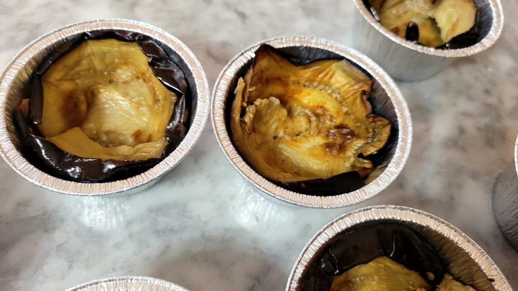 ➡️Bekleed de bakvormpjes met de aubergines afhankelijk van de grootte van de plak, 1 en 1/2 of 2 plakken, en bedek de bodem en de zijkanten goed.
