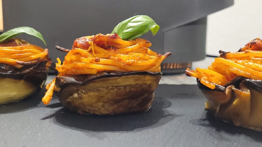 Ik hou van porties voor één persoon en ook van spaghetti alla norma, een typisch Siciliaans gerecht met gefrituurde aubergines en gezouten ricotta. Het verschil met de originele versie zit in de dubbele kookwijze die niet is voorzien, omdat de spaghetti eenmaal klaar direct moet worden opgediend, en in het gebruik van de luchtfriteuse voor zowel het koken van de aubergines als de timballi. Zeker een lichter gerecht, maar niet minder smaakvol dan de klassieke versie. U kunt het van tevoren bereiden en het koken in de friteuse of in de oven voortzetten vlak voor het opdienen.