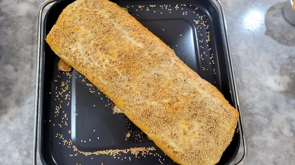 Haal de strudel eruit als hij klaar is en laat hem een paar minuten rusten voordat je hem van het rooster of de schaal haalt