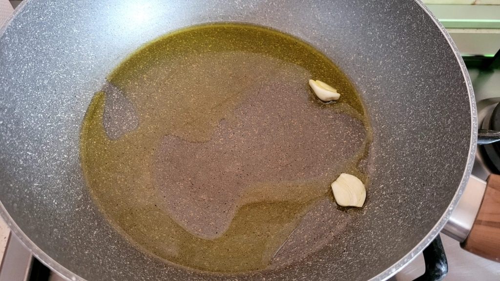 Neem een ruime koekenpan en bak de knoflook met een flinke scheut olie