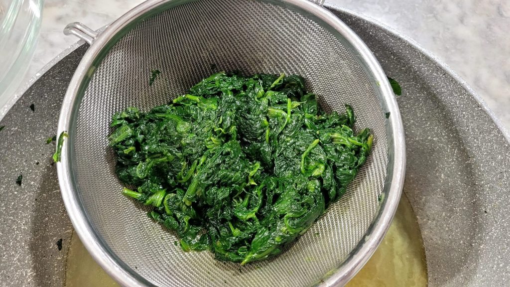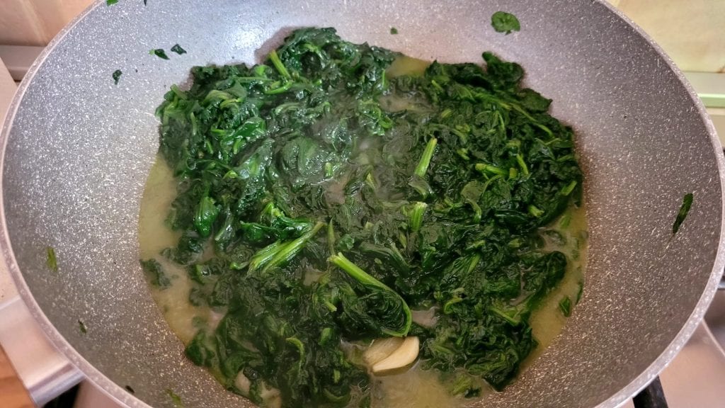 Voeg de eerder gewassen spinazie toe, zout toevoegen, deksel erop en laat ze koken, het duurt maar een paar minuten