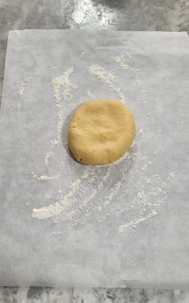 Na de rusttijd verwijder je de folie en rol je het deeg uit tussen twee velletjes bakpapier, licht bestoven met bloem.