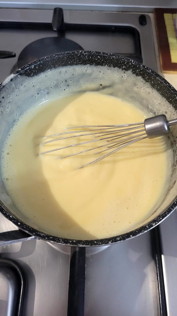 Blijf continu roeren met de garde, zodat er geen klontjes ontstaan, en laat de crème indikken.