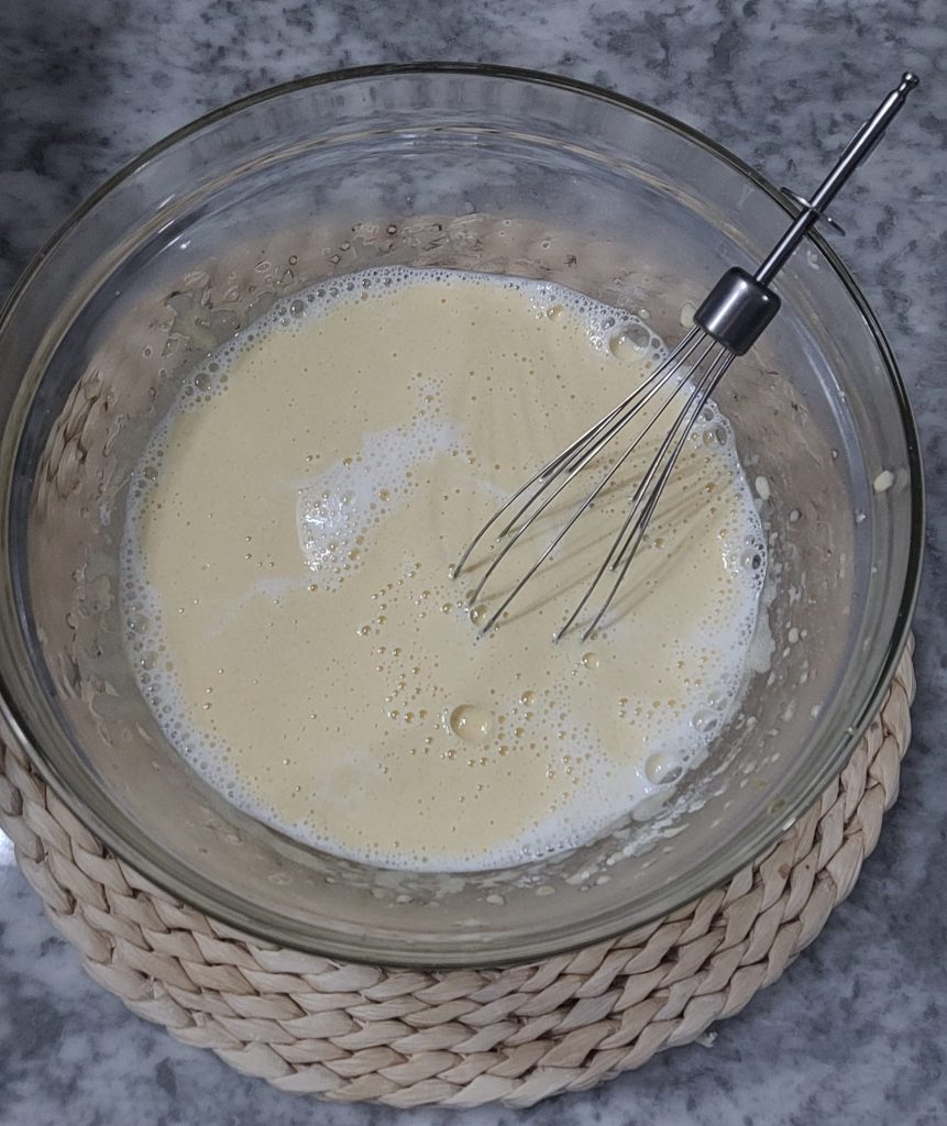 Giet de melk bij het eimengsel met de suiker en klop het met de handgarde tot het goed gemengd is.