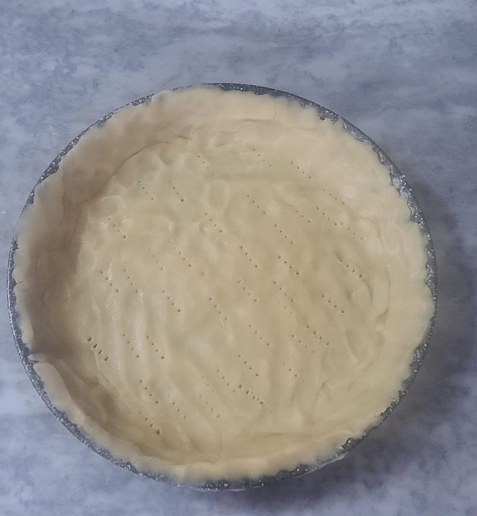 Bekleed de vorm, die je eerder hebt ingevet en bebloemd, met het zanddeeg. Werk de randen af en prik de bodem in met een vork. Dek af en zet de vorm 15 minuten in de vriezer of een halfuur in de koelkast.