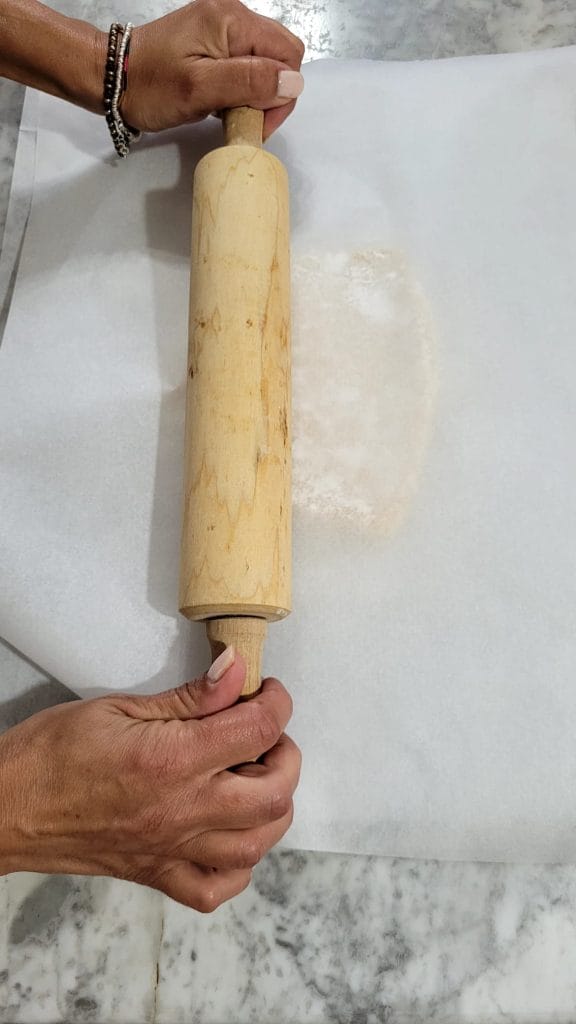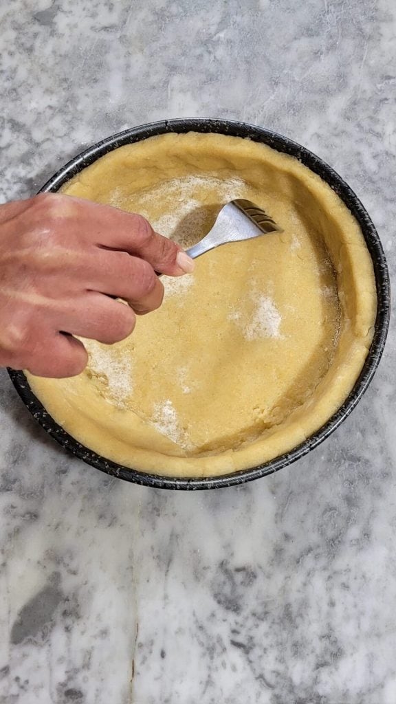 Na de rusttijd in de koelkast, rol je 3/4 van het deeg uit met behulp van een deegroller, tussen twee licht met bloem bestoven bakpapier vellen en vorm je een van de twee schijven die je nodig hebt voor de taart