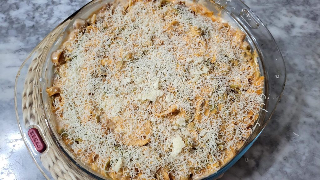 Neem de bakvorm en bedek de bodem met een laag Parmezaanse room en verdeel de pasta afwisselend met de Parmezaanse room totdat alle ingrediënten op zijn
