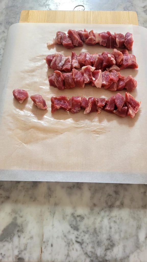 Snijd de varkenshaas stukjes in 2 of 4 delen afhankelijk van de grootte van elk stuk