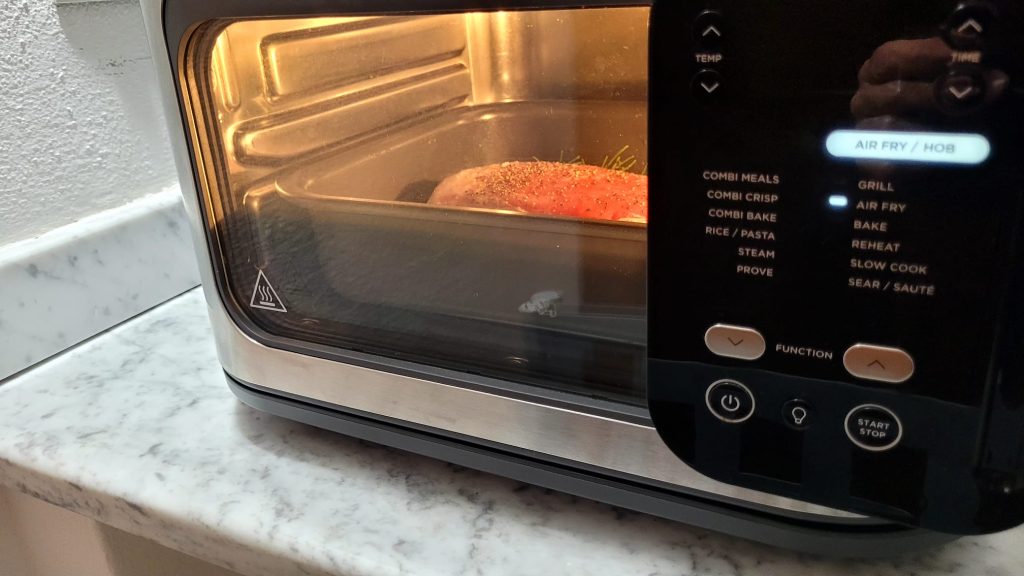 • Leg de haas op een snijplank en snijd het in dikke plakjes. Zoals je op de foto kunt zien moet het aan de binnenkant licht roze blijven, maar als je het iets meer doorbakken wilt, kun je het in plakjes snijden en nog een minuut in de airfryer op 180° laten staan