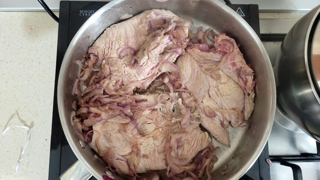 Het is niet nodig om dure wijn te gebruiken, een glas van een volle wijn is voldoende. Voor dit recept heb ik een negroamaro gebruikt. Voor de ui heb ik gekozen voor de rode ui, die een beetje zoetheid aan het gerecht toevoegt, samen met de wijn geven ze een zeer uitnodigend en smaakvol aroma.