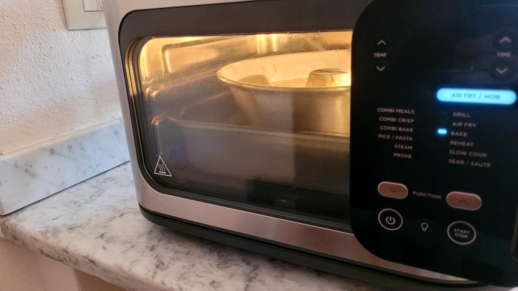 Voeg tenslotte de in blokjes gesneden appel toe, meng en giet het beslag in de vorm die je al had ingevet en met bloem bestoven. Maak het glad en plaats de vorm in de airfryer of oven