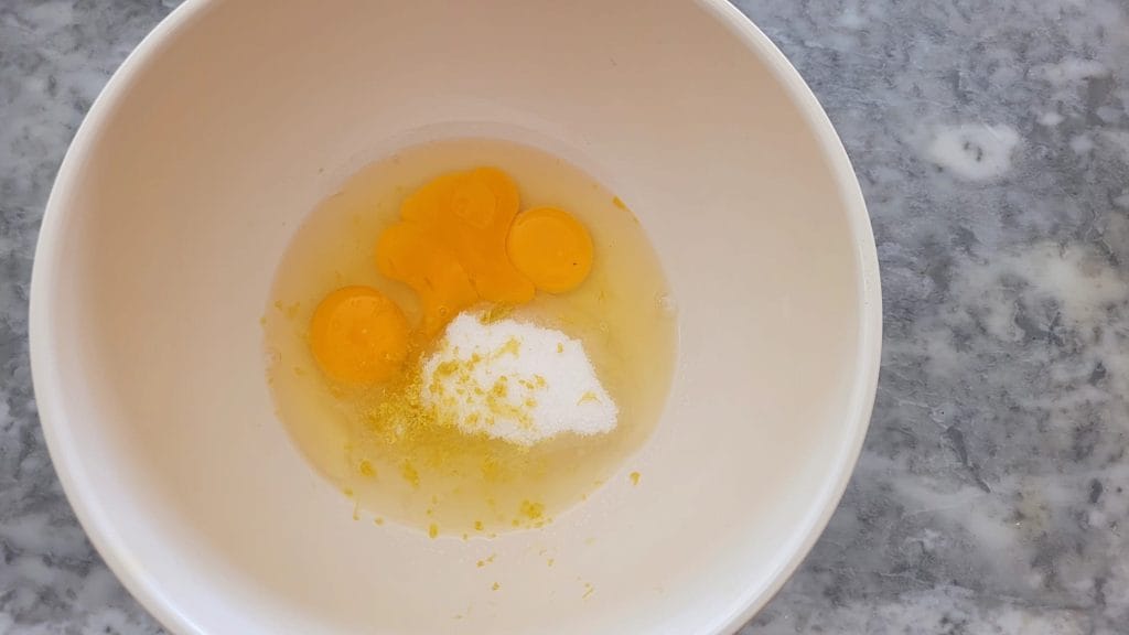 Doe de eieren met de suiker en de geraspte citroen in een grote schaal